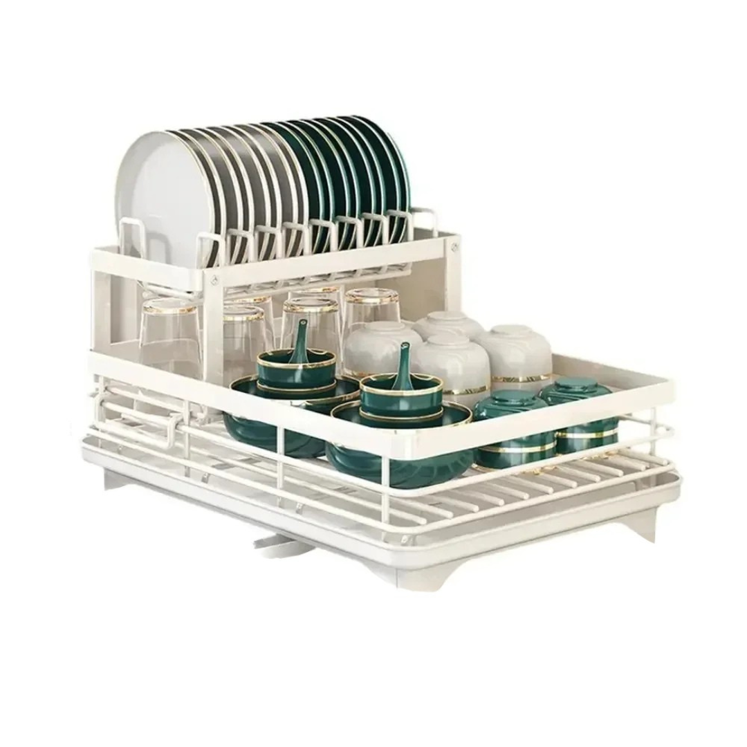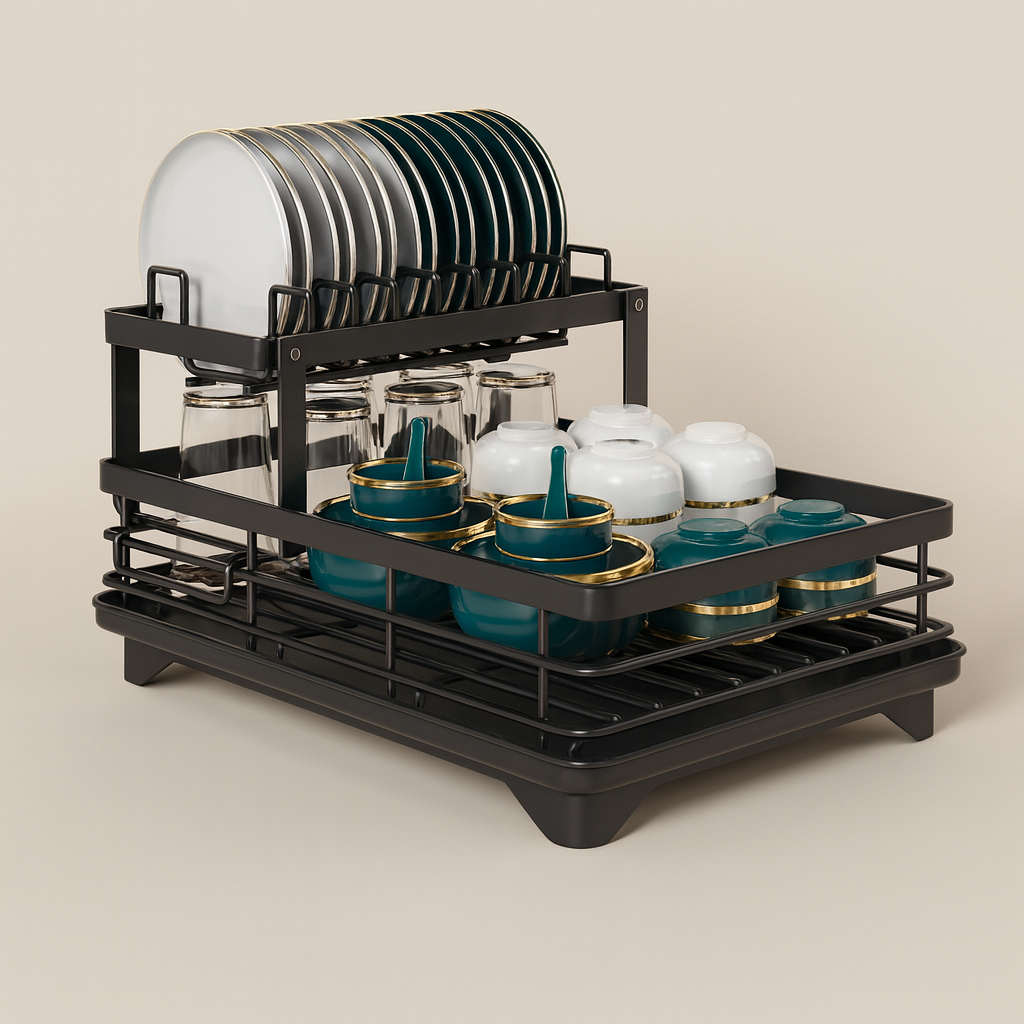 Feito em aço carbono espesso antiferrugem, o escorredor suporta peso sem entortar ou balançar, oferecendo segurança até para grandes volumes de louça. Com tubo de drenagem integrado, a água escorre diretamente para a pia, evitando acúmulo e mantendo a bancada limpa e seca. Sua estrutura funcional conta com divisórias para pratos, copos, talheres, tigelas e xícaras, além de uma camada superior destacável que pode ser ajustada conforme a necessidade.
